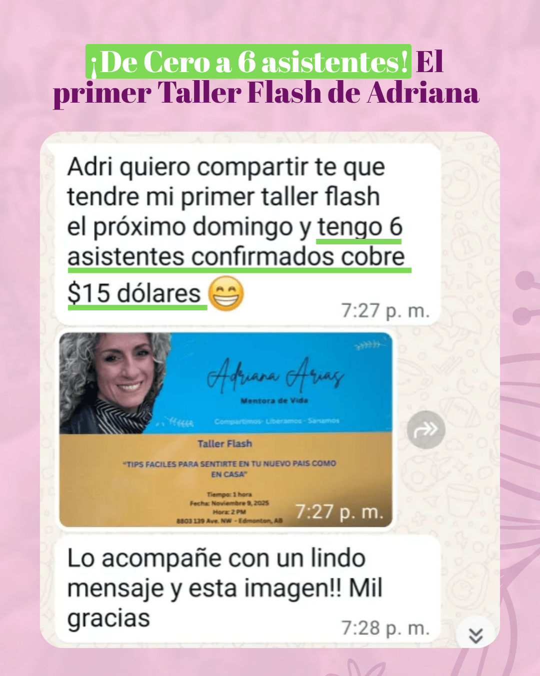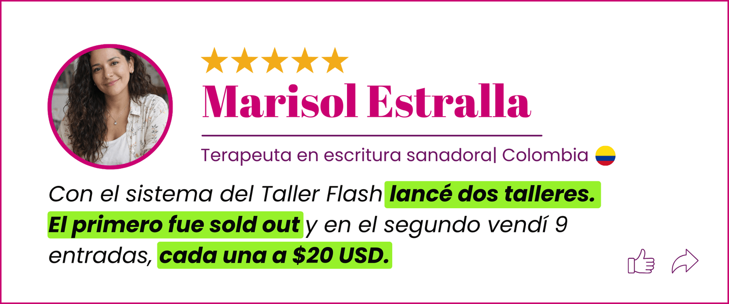 En esta oferta, comparte una de sus metodologías más accesibles y potentes: el Taller Flash® de Empoderamiento de Mujeres®, una fórmula que ya ha ayudado a más de 800 mujeres a hacer realidad su propósito de trabajar con audiencias de mujeres a través de talleres.